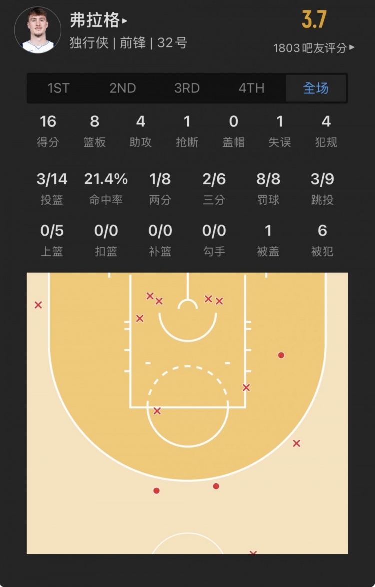 獨(dú)行俠狀元秀 庫珀-弗拉格 登場(chǎng)33.5分鐘