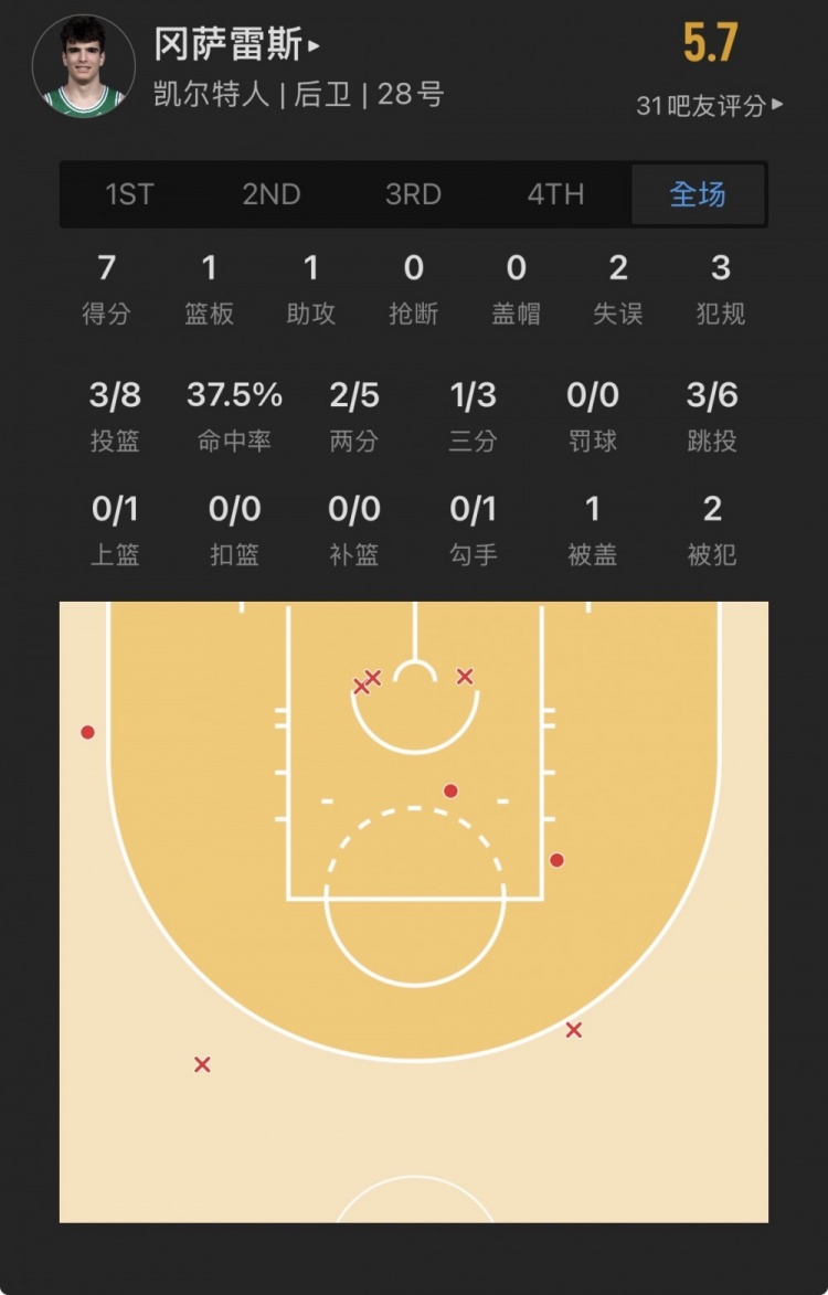 凱爾特人28號(hào)秀 烏戈-岡薩雷斯 登場(chǎng)17.0分鐘