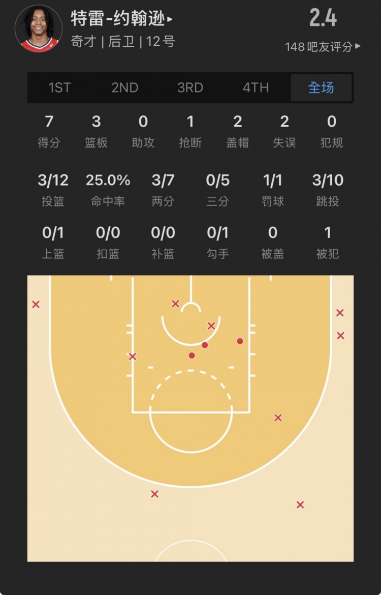 奇才6號(hào)秀 特雷-約翰遜 登場(chǎng)24.7分鐘
