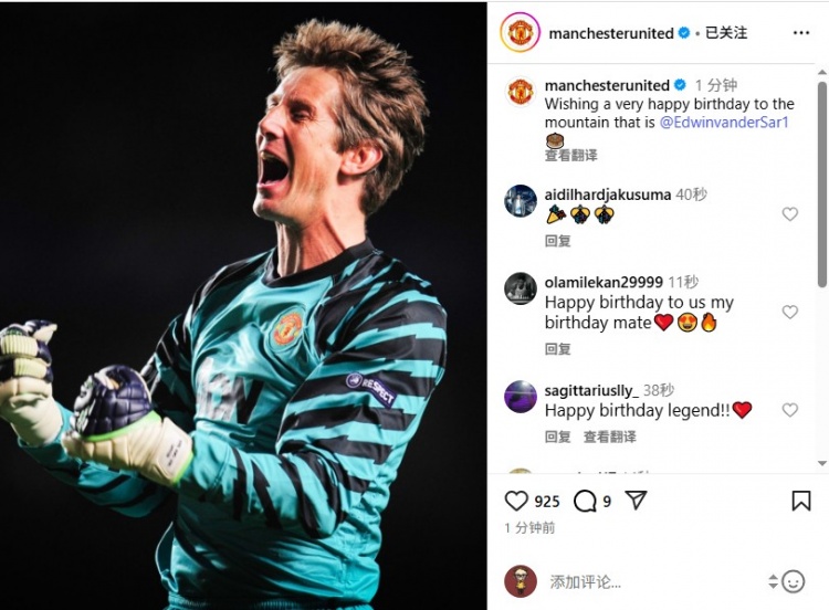 曼聯(lián)官方Instagram寫(xiě)道:“祝門(mén)前的那座大山——范德薩生日快樂(lè)!”